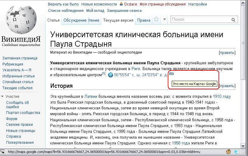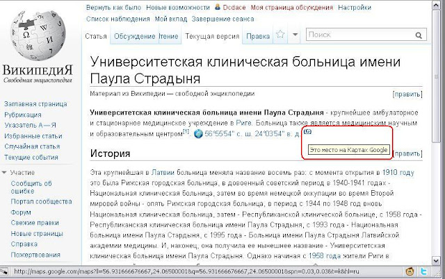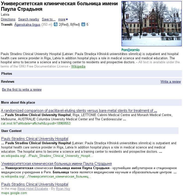 Pētot Stradiņu slimnīcas nosaukuma iespējamos avotus, atradu kādu interesantu faktu. (Stradiņu slimnīca Rīgas kartē arī jau labu laiku tiek attēlota krievu valodā.) Noklikšķinot uz nosaukuma un atverot papildus info, apakšā redzam „User Content” sadaļu. Tur noklikšķinām uz krievisko vikipēdijas ierakstu un redzam pievienoto koordinātu atribūtu, kuram vēl klāt ir parametrs (G) ar paskaidrojuma tekstu „šī vieta ir attēlota Google kartē”.